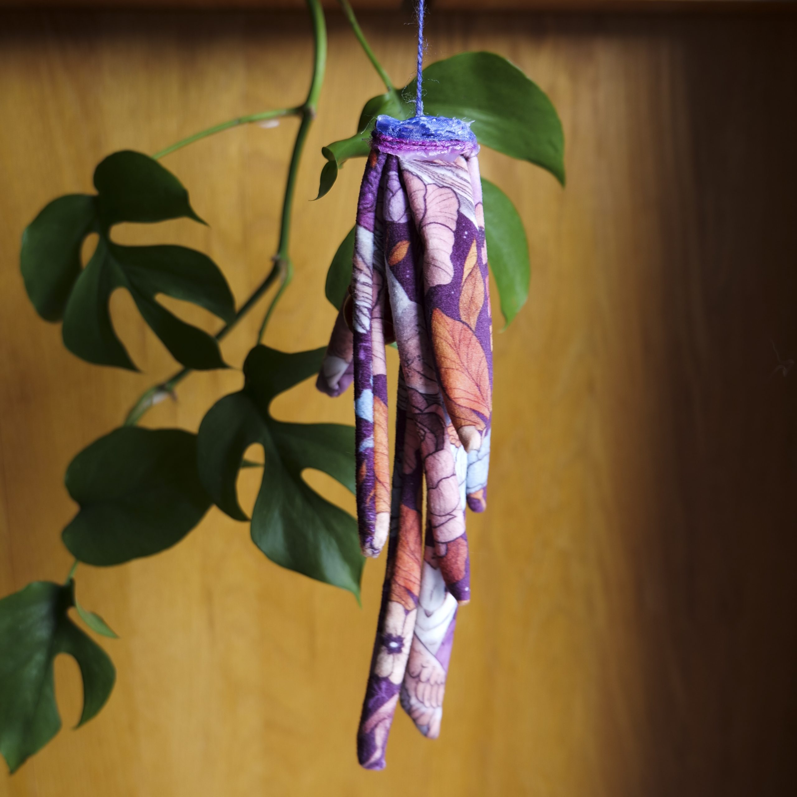 Cette baguette de jeu est le fruit d’une démarche éco-sensible (Upcycling). Au lieu de laisser de côté les précieuses chutes de Cretonne et de Velours, je les assemble pour créer un plumeau généreux et texturé. Les bandes de tissus s’entremêlent et s’agitent, créant une cible mouvante qui éveille l’instinct de jeu tout en douceur.