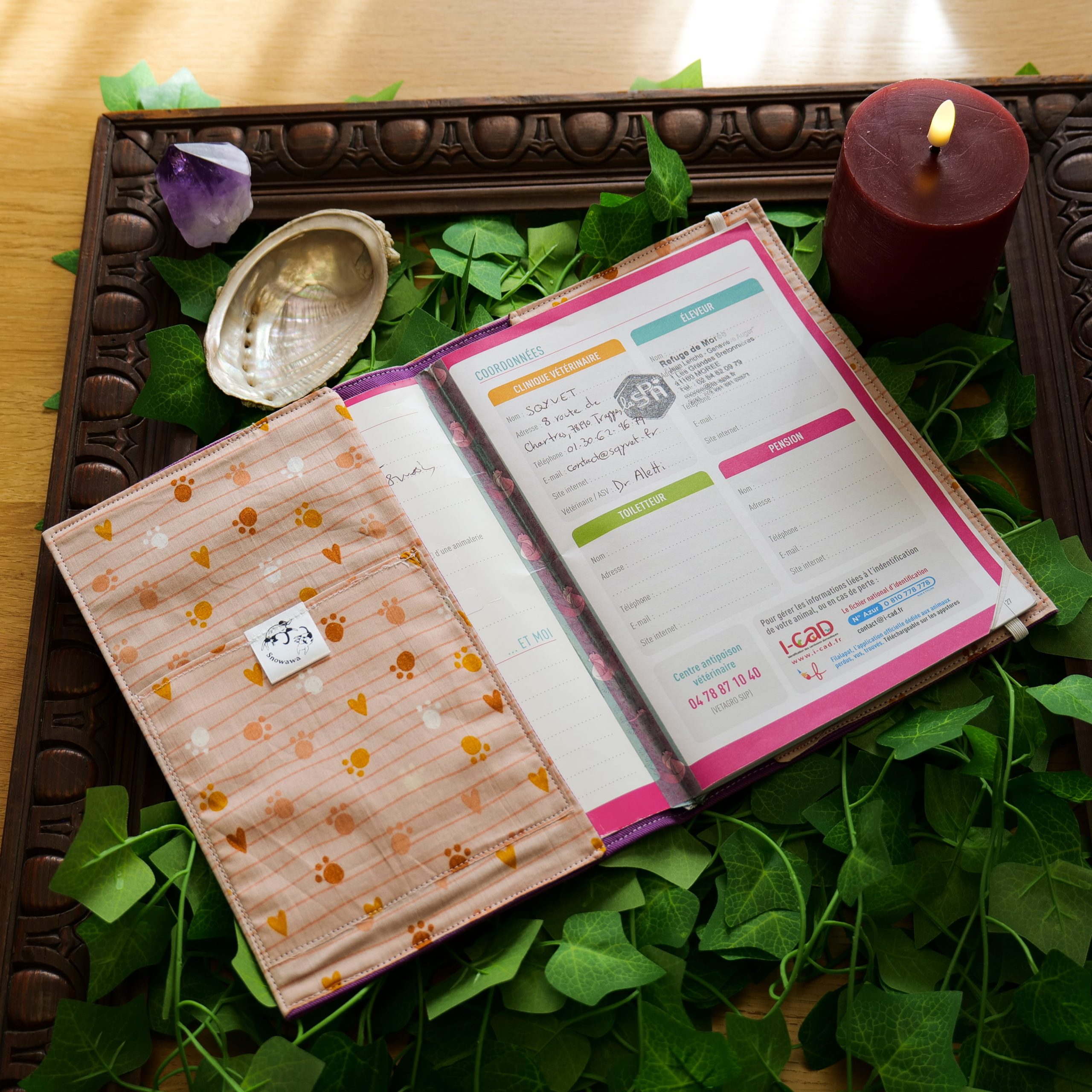 . L’Alcôve Secrète : À l’intérieur, une poche spécifique a été tissée pour accueillir le Passeport de votre familier, médicaments, ou autres. Tout est centralisé : carnet et passeport ne se quitteront plus.